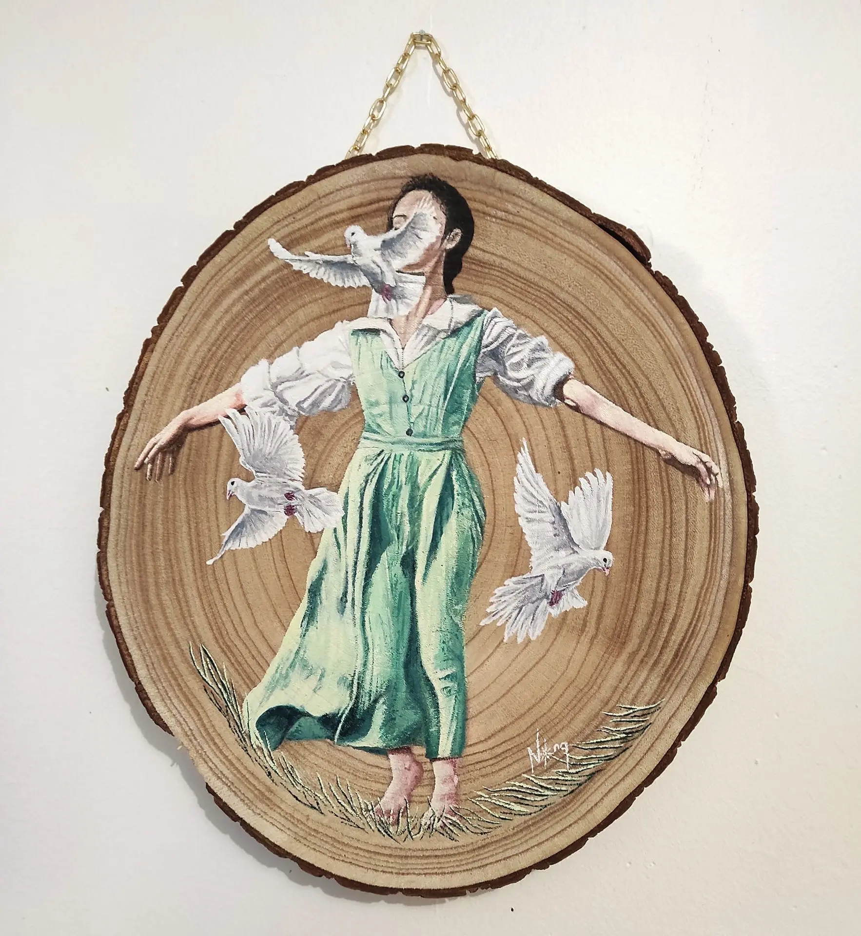 La peinture sur rondin de bois est un autre plaisir dans mon art. Le bois est un support noble qui offre de multiple possibilités de décoration, un matériau qui réchauffe votre intérieur et le rend accueillant. J'aime y peindre mes idées les plus oniriques, celles qui vous font voyager dans un autre monde. Je présente ces peintures sur les marchés artisanaux et les marchés de Noël afin d'amener l'art aux gens d'une toute autre manière et à un prix abordable pour tous.
